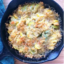 Wash yellow squash and dry with paper tower. Slice about ⅛” thick, salt and pepper to taste, add corn meal as much as squash will absorb. Put small amount of oil in large fry pan, when hot add enough squash to cover bottom of pan. Cook fast and continue to turn with spatula. When about half done, add onion to taste. Brown to light golden. Put on paper towel to absorb excess oil. Then repeat process. It’s important to use only enough oil to fry good, cook fast and turn often to brown evenly.